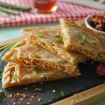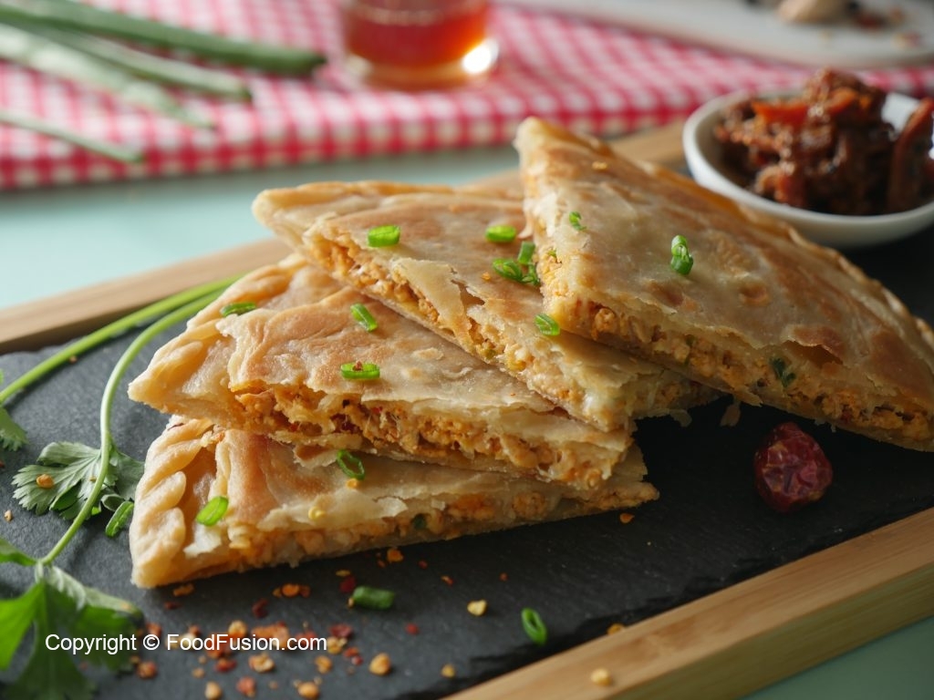 Roll out another dough with the help of rolling pin,add & spread prepared chicken filling,green onion leaves,mozzarella cheese,place another rolled dough,press & seal the edges (makes 6).