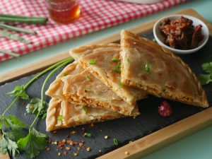 Ek aur dough ko bail lein aur tayyar chicken filling dal ker peela lein,hara pyaz leaves aur mozzarella cheese dal ker upper sa ek aur rolled dough rakh dein aur press ker ka edges ko seal ker lein (makes 6).