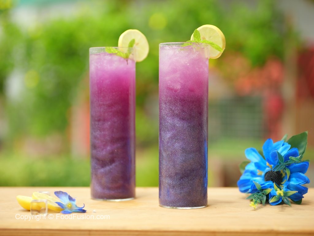 -Glass mein crushed ice,tayyar butterfly pea syrup (3/4 cup) aur edible silver glitter dal ker ache tarhan mix ker lein.