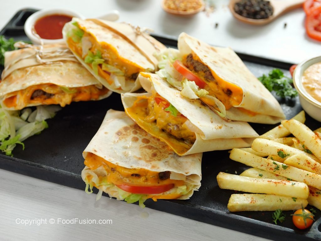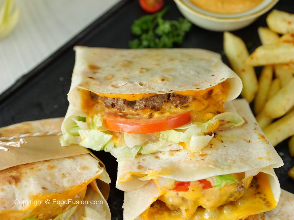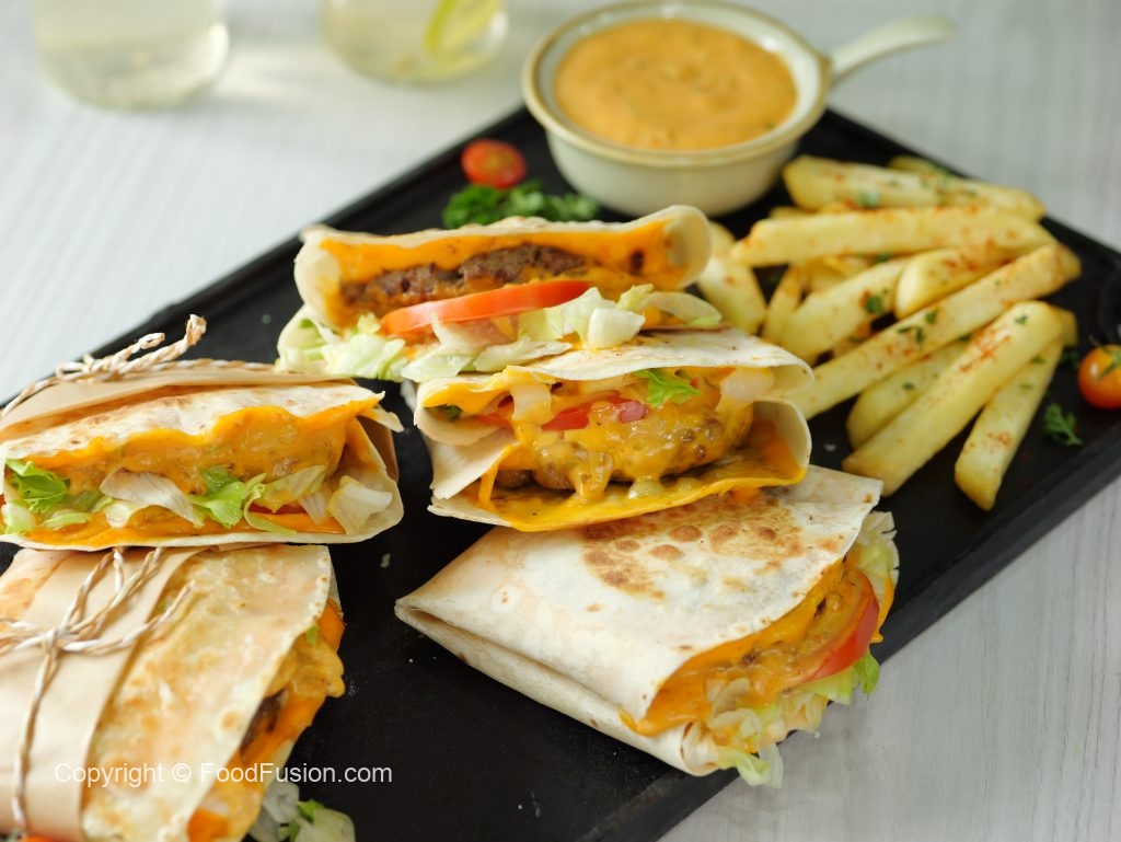 -On a tortilla wrap,place two cheddar cheese slices,beef patty on one cheese slice,iceberg,tomato, prepared burger sauce on beef patty & fold sides to make a wrap.