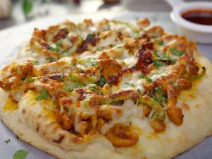 -In a baking tray (lined with baking paper),add naan,cooked chicken & mozzarella cheese (2 makes).