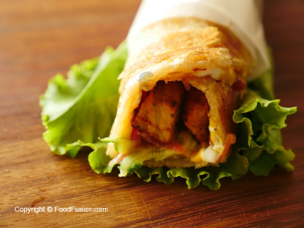 On fried paratha,add mayonnaise,tomato ketchup,mustard paste,cucumber,carrot,fried chicken chunks and wrap & serve.