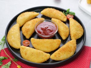 Cut one side of tortilla,add & spread chicken tikka spread,cheese slice,cucumber,tomato, potato fries and drizzle tomato ketchup,fold and grill for a minute & serve!