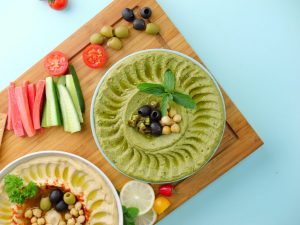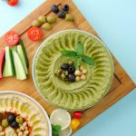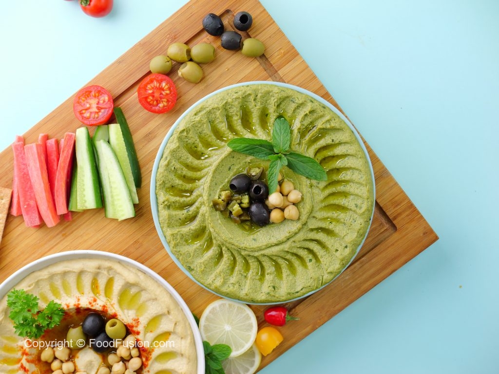 -In a serving dish,add green hummus,add black olives,pickled jalapenos,chickpeas,olive oil,garnish with mint leaves & serve with pita bread.