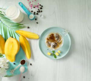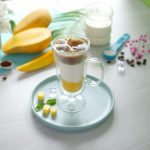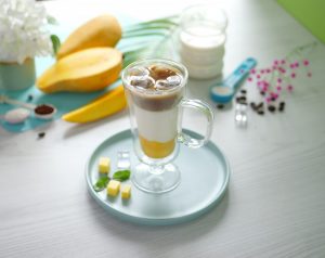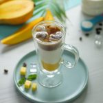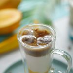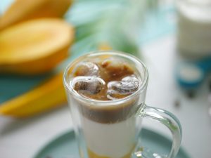 -Glass mein mango puree (2-3 tbs),ice cubes,tayyar milk mixture (1/2 Cup) aur dissolved coffee (2 tbs) dal ker ache tarhan mix ker lein & serve karein!