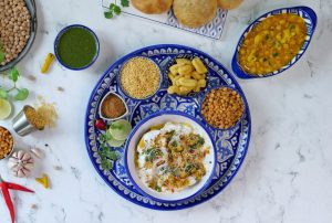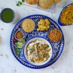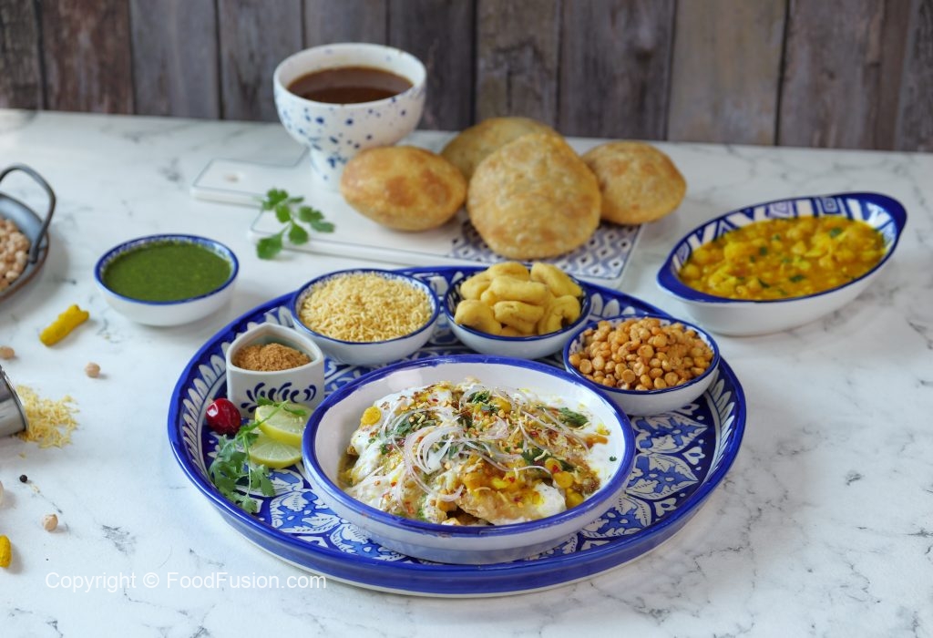 -On serving dish,break kachoris,add prepared tarkari,yogurt,chaat masala,green chutney,imli ki meethi chutney,onion,red chilli crushed,nimco sev,fresh coriander & serve!