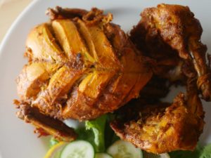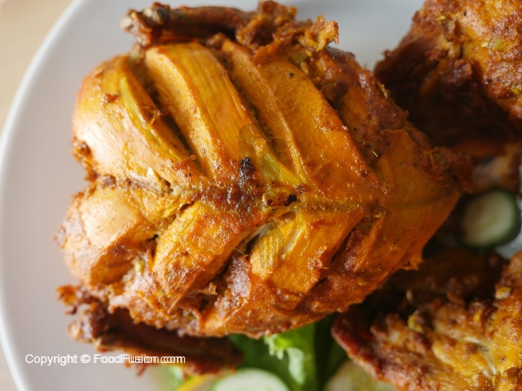 In wok,heat oil and deep fry whole chicken until golden brown.