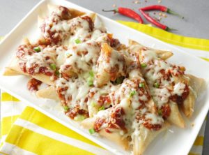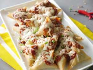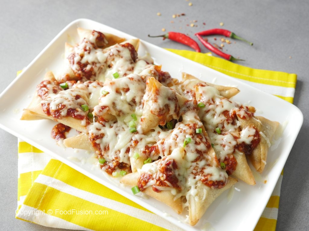 Serving paltter mein fried samosa rakh ker tayyar fire sauce pour karein.