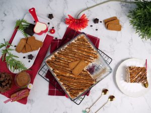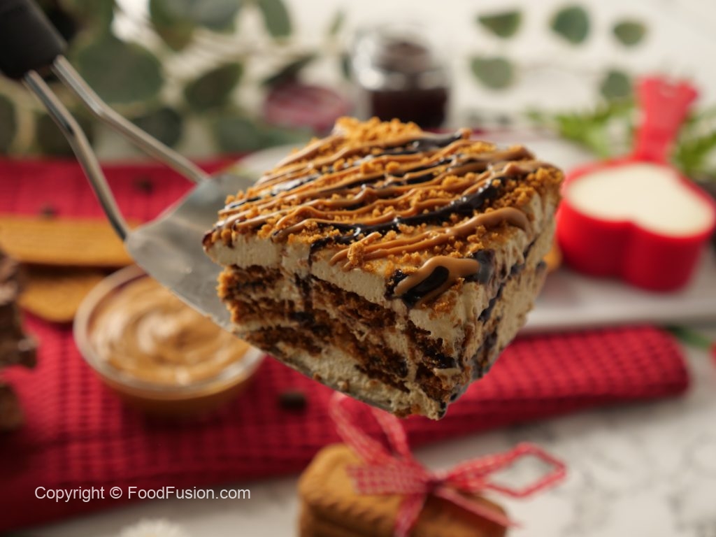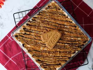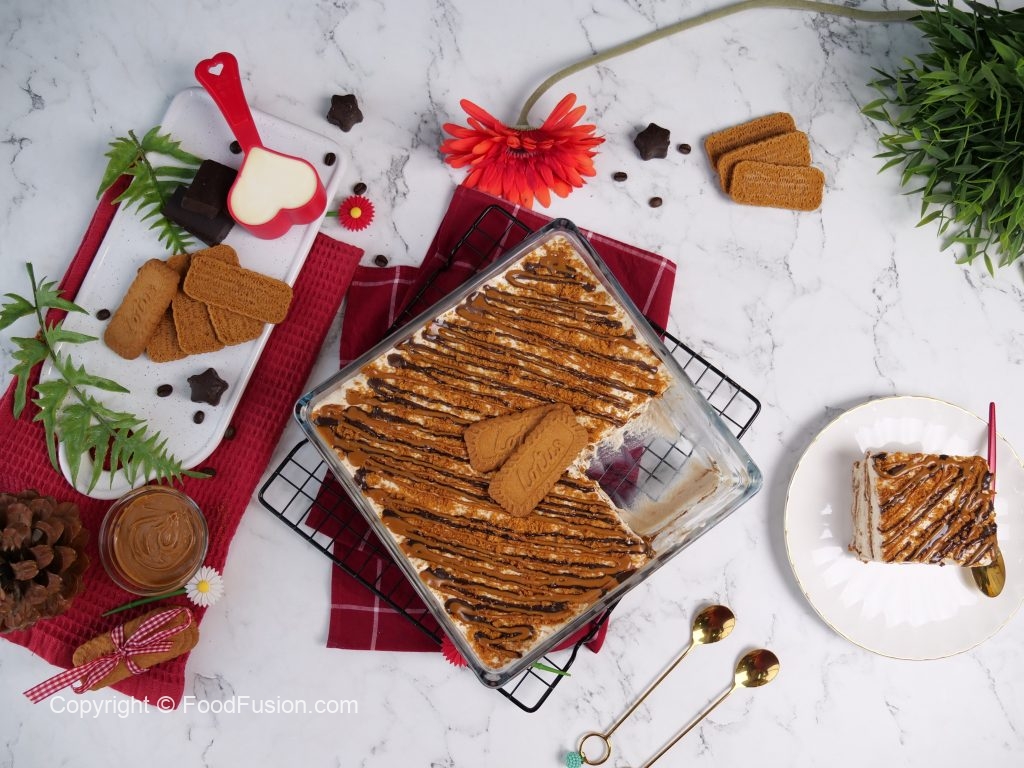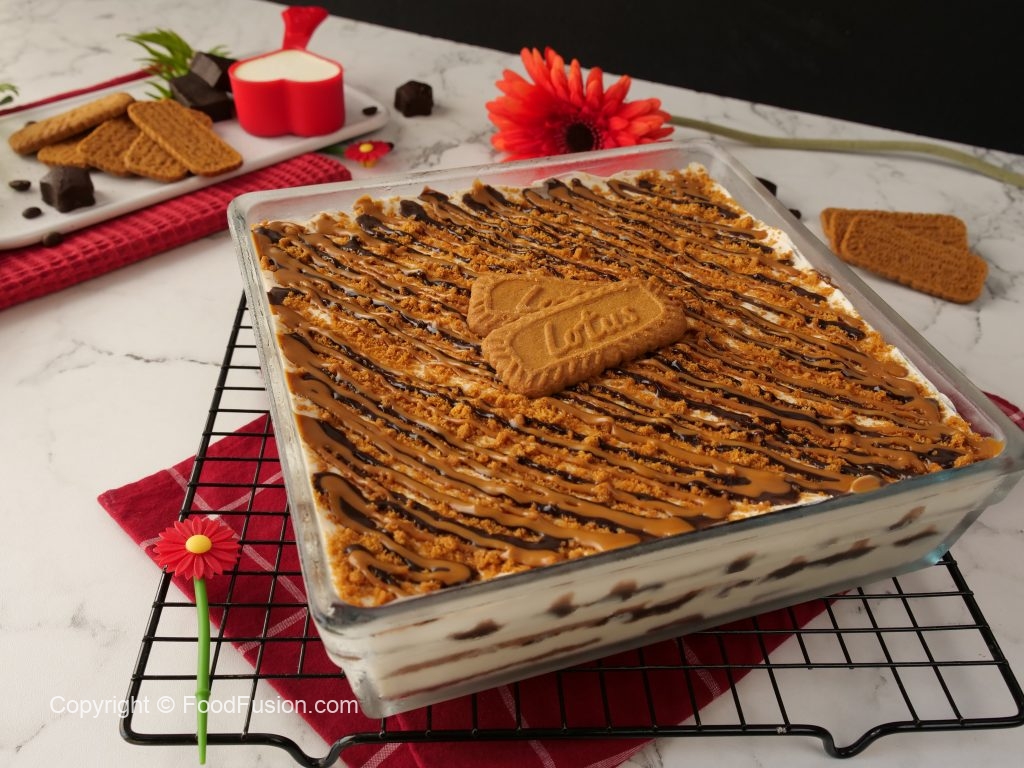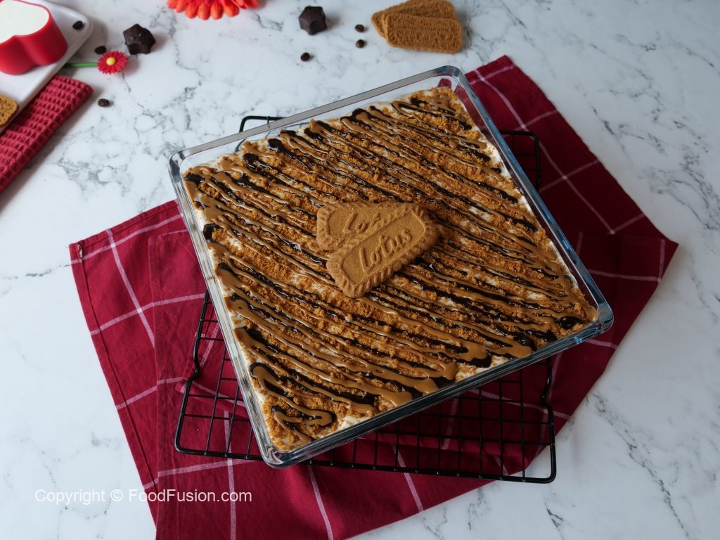 -In (8 x 8 inch) serving dish,add & spread prepared lotus cream filling,lotus biscuits,lotus cream filling,chocolate ganache,lotus biscuits,lotus cream filling,chocolate ganache,lotus biscuits,lotus cream filling,spread evenly & refrigerate for 6 hours.