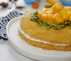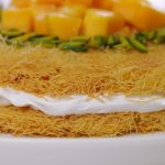 -Add & spread mango whipped cream & spread evenly then place another kunafa layer & pour warm sugar syrup.