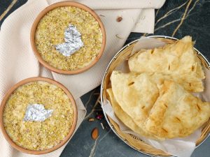 In a serving glass add ice cubes, mango chunks, almonds, prepared mango shake and ice cream scoops.