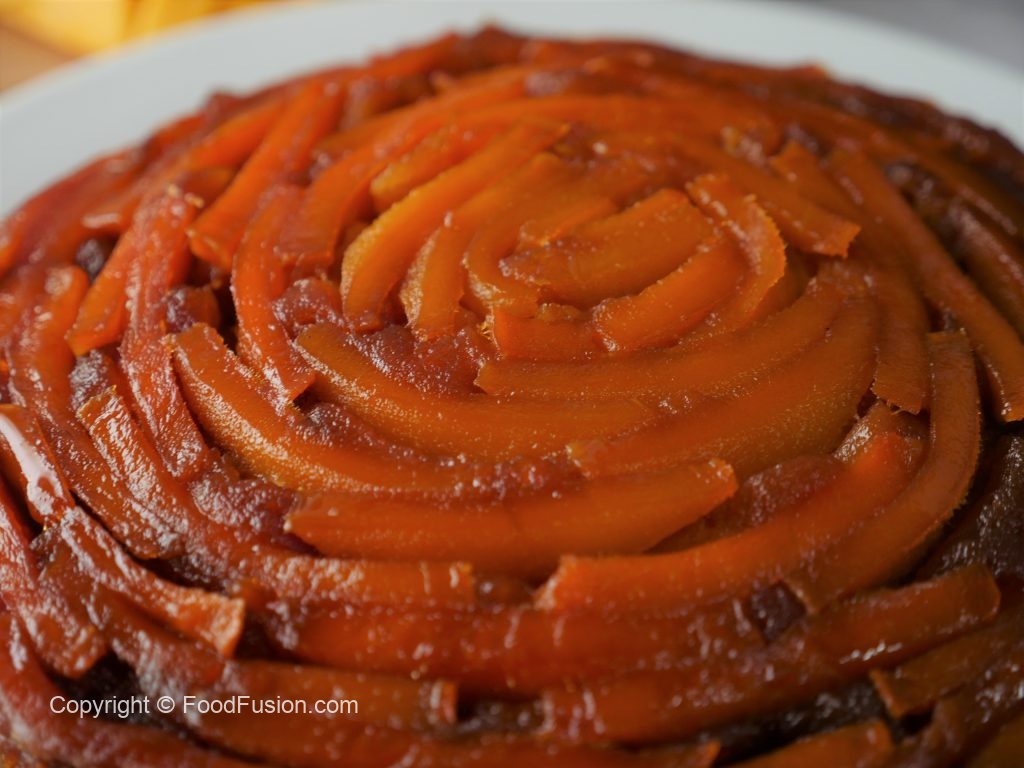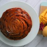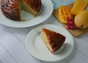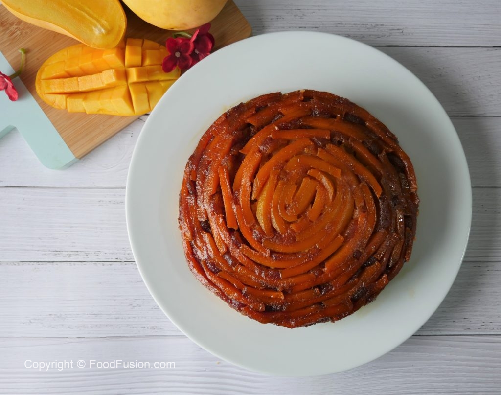 8 x 8 inch baking pan mein caramelized cheeni dal ker mango slices laga lein & side per rakh dein.