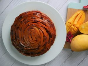 In 8 x 8 inch baking pan,add caramelized sugar and place mango slices & set aside.
