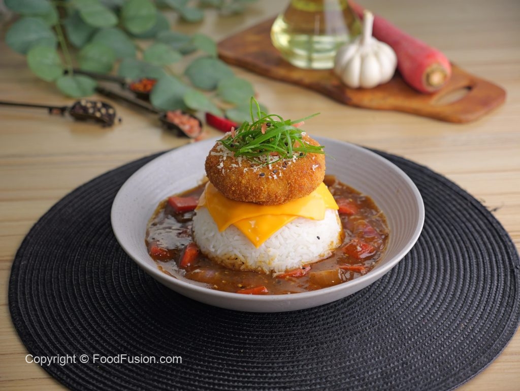 -In a serving platter, add boiled rice, prepared sauce, cheese slice, prepared menchi katsu, & garnish with spring onion, sesame seeds then serve!