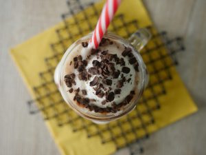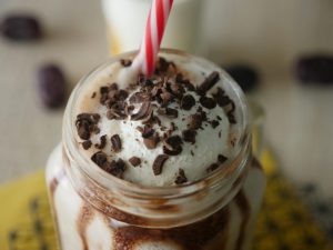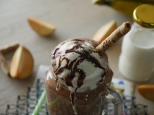 Serving jar mein tayyar smoothie aur ice cream dal dein aur chocolate syrup sa garnish ker ka chilled serve karein.
