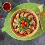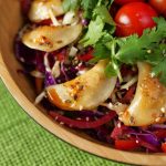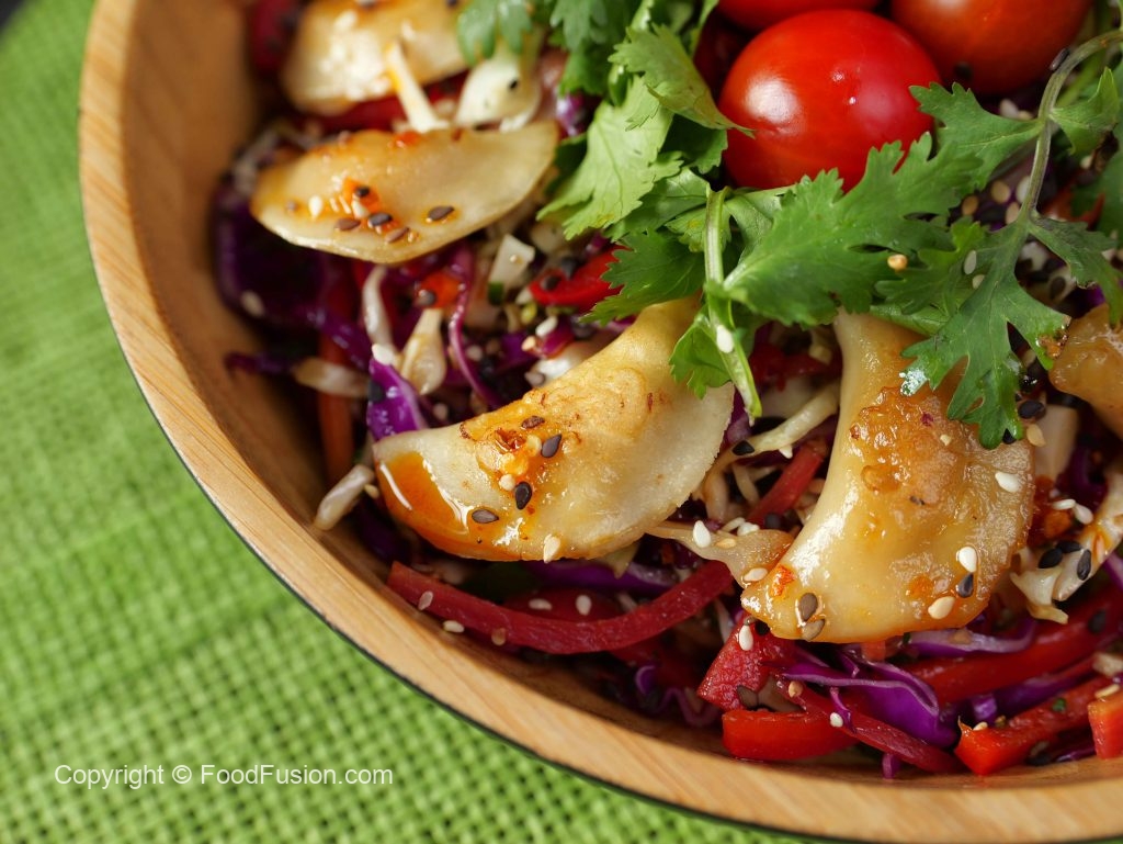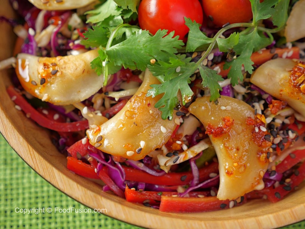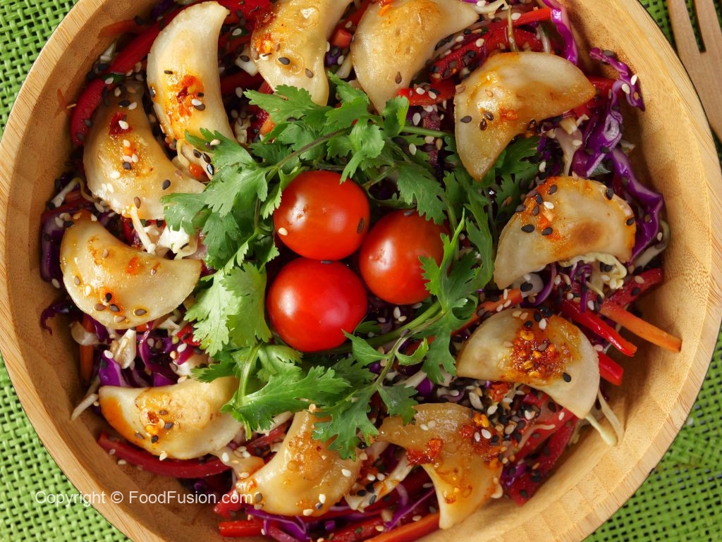 -In a serving bowladd prepared salad,fried dumplings & garnish with fresh coriander,cherry tomatoes, chilli oil,sesame seeds & serve!