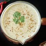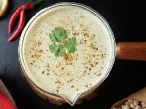 In a blender jug,add chickpeas,yogurt,garlic,green chillies,fresh coriander,lemon juice,salt,cumin seeds,water & blend well.