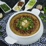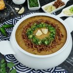 Tayyar cooked mutton gravy ka saath dal ker ache tarhan mix karein aur hand blender ki madad sa coarsely blend ker lein.