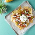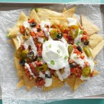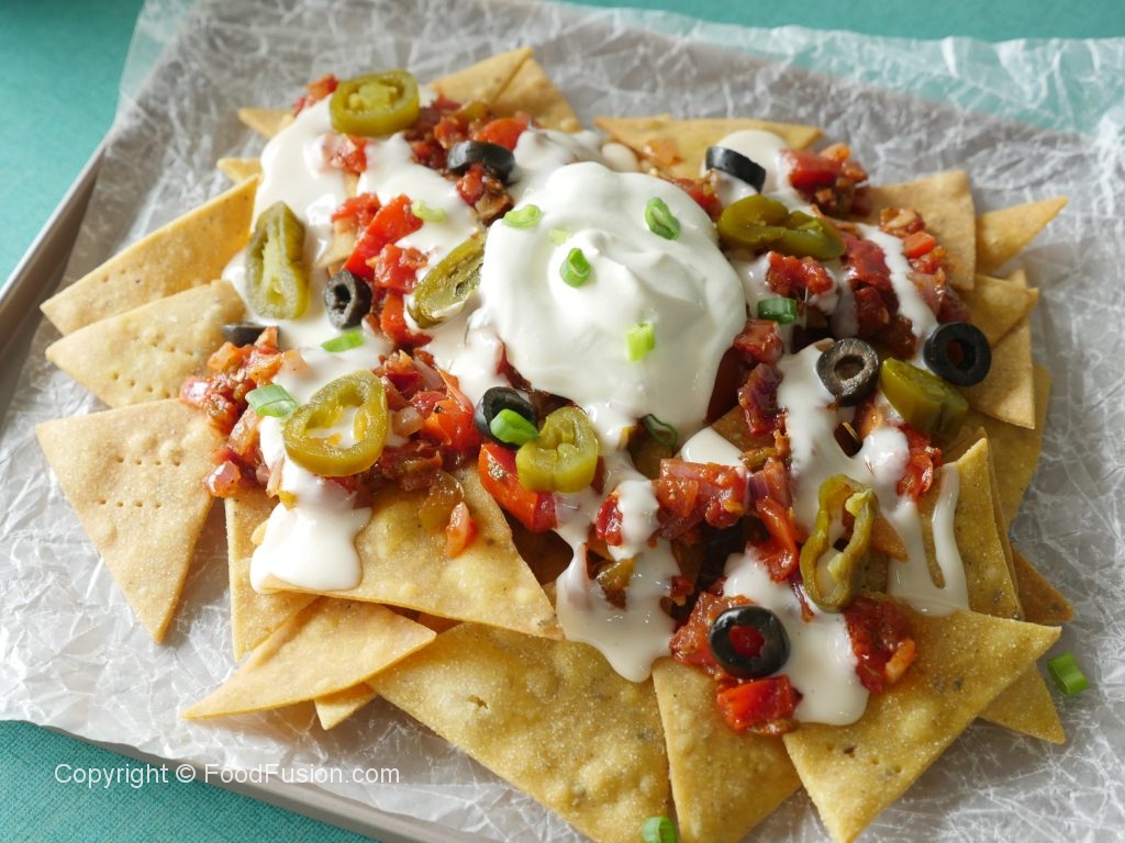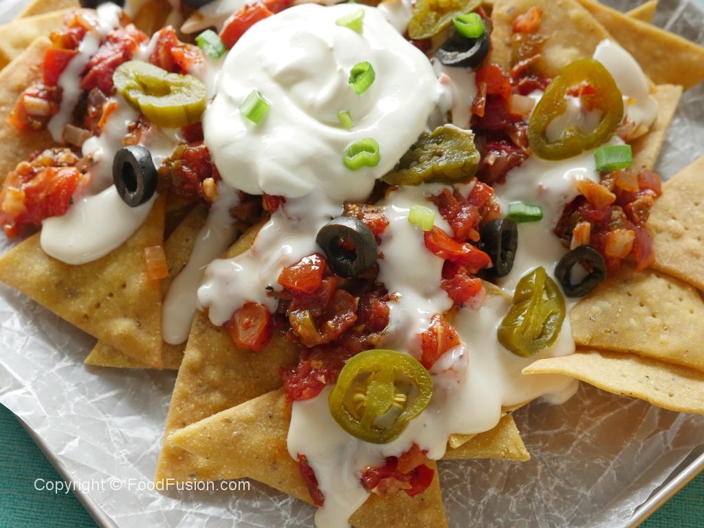 Top nachos with salsa,cheese sauce,jalapenos,black olives,green onion leaves,sour cream & serve!