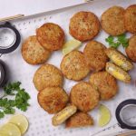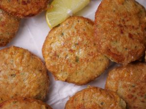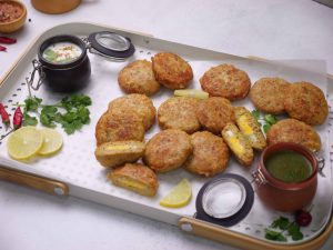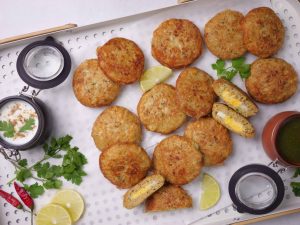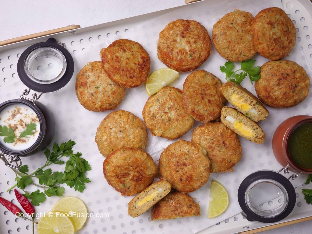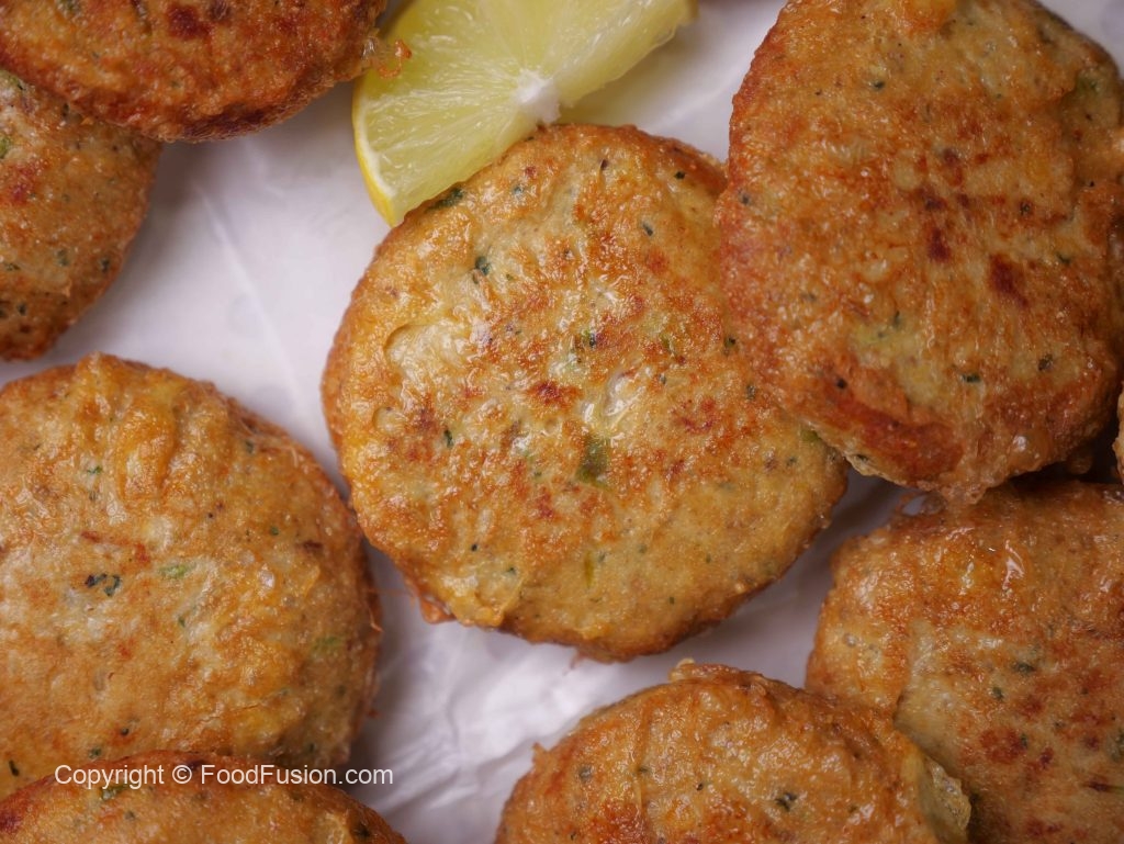 -In frying pan,heat cooking oil,dip patty into whisked egg & fry on medium flame until golden (makes 14).