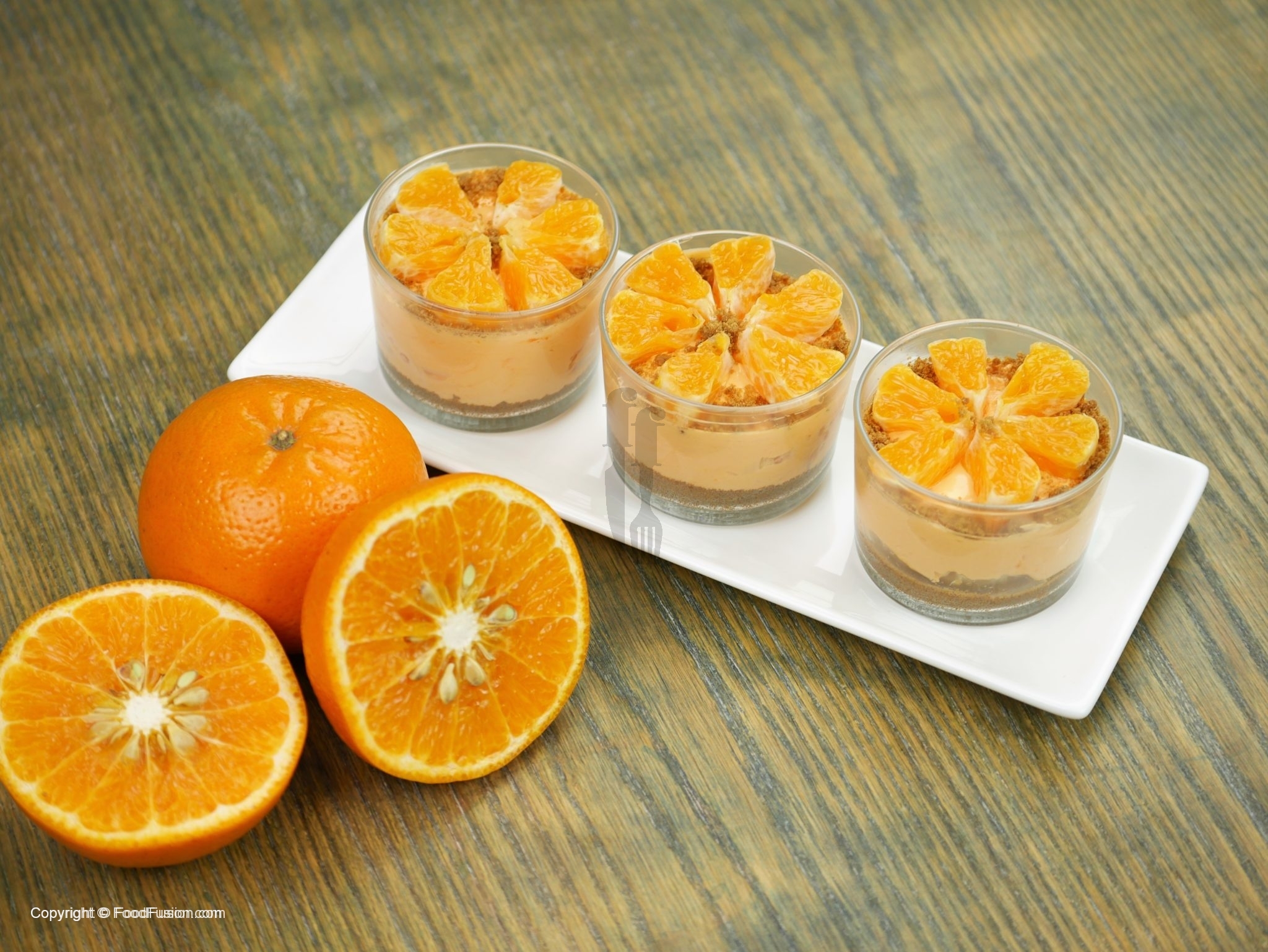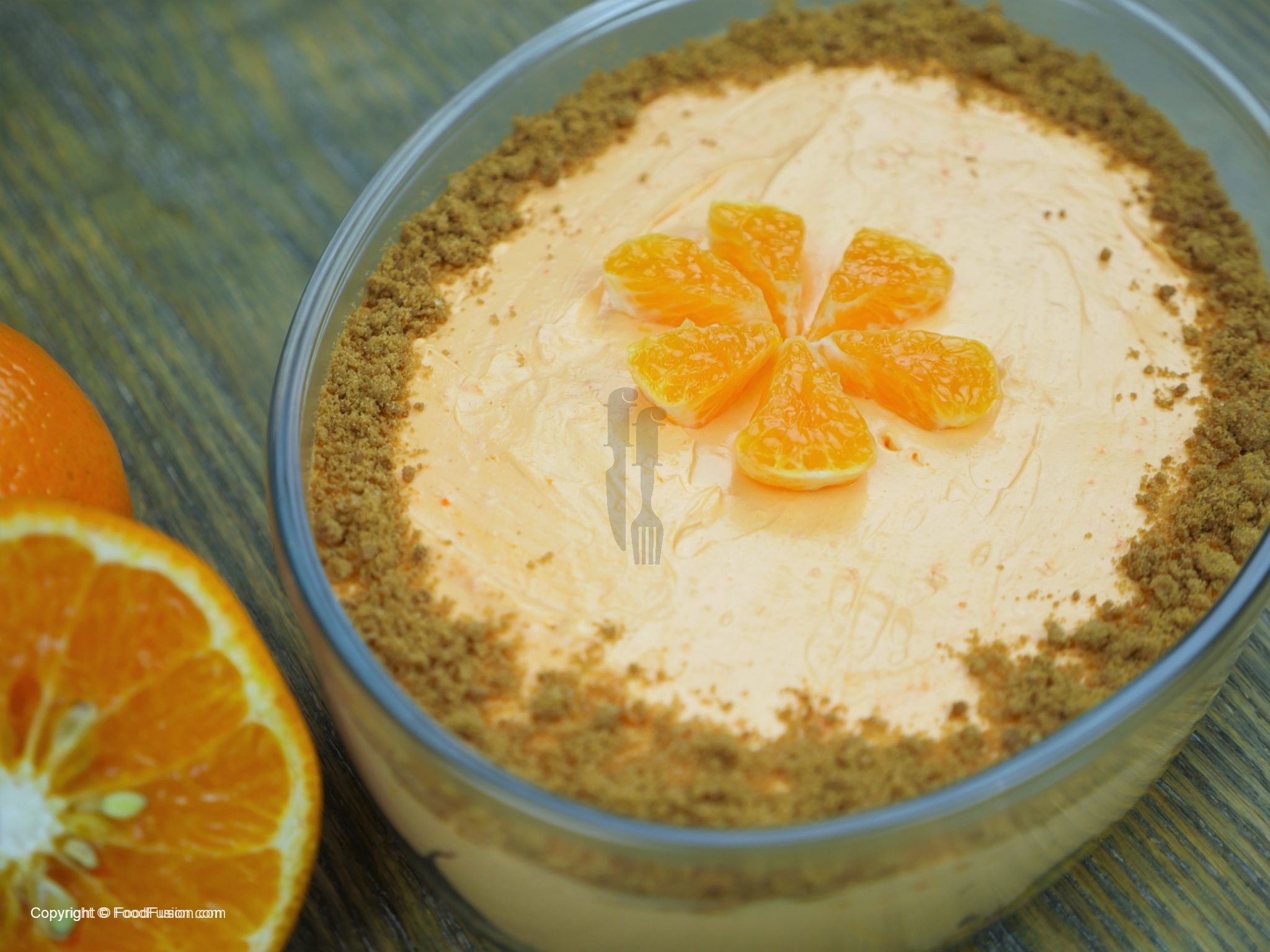 Biscuit crumbs aur oranges slices sa garnish karein.