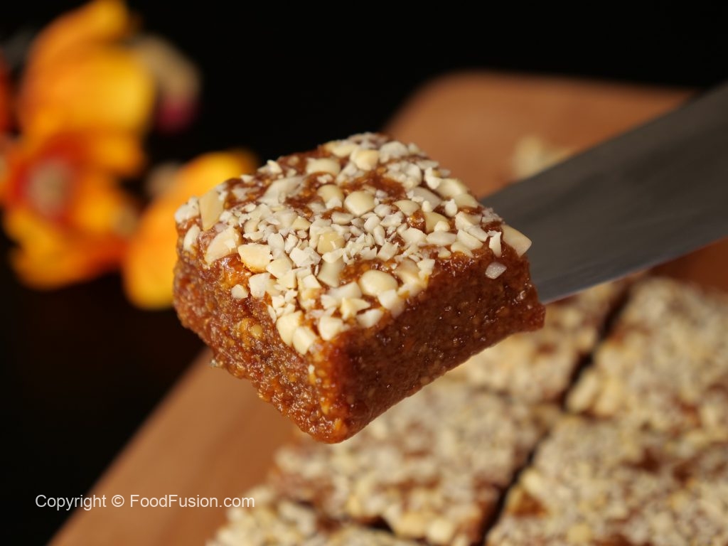 -On a greased mold,add peanuts,prepared barfi & spread evenly.