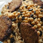 On serving dish,add cooked rice,chickpeas,reserved black raisins,peshawari beef chapli kabab on top and serve!