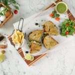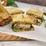 -Bread slice per tayyar pesto sauce dal ker pheela lein,palak,tamatar slice,cheddar & mozzarella cheese,chicken fillet,cheddar & mozzarella cheese aur pesto sauce dal dein aur dosray bread slice sa cocer ker lein aur cheese melt ho janay tak grill ker lein (makes 3).