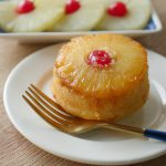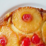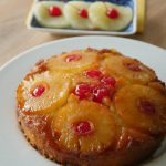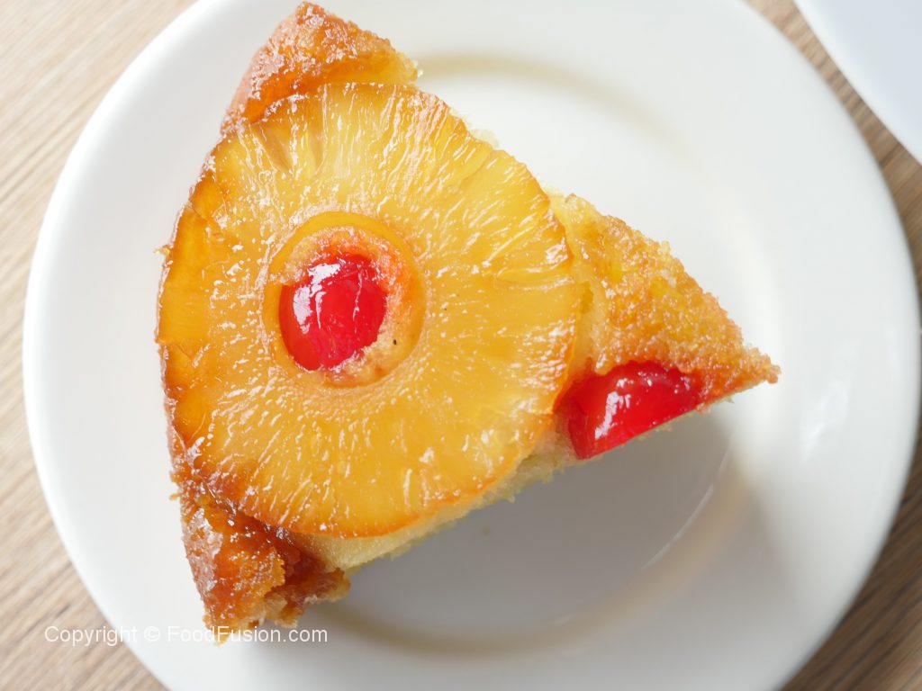 8 x 8 inch baking pan mein cooked sugar syrup dal ker pineapple rings aur cherries rakh dein aur tayyar batter pour ker lein.