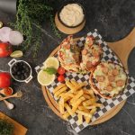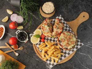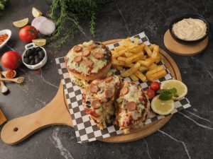 On a cast iron grill pan,add cooking oil & grill chicken burger patties & chicken sausages until golden brown & set aside.
