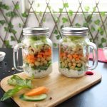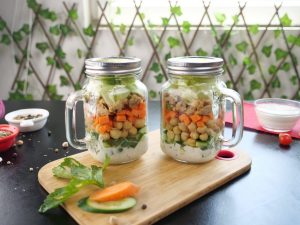 -In a mason jar,add prepared ranch dressing,cucumber,chickpeas,carrot,celery,cooked chicken, iceberg & cover with lid.