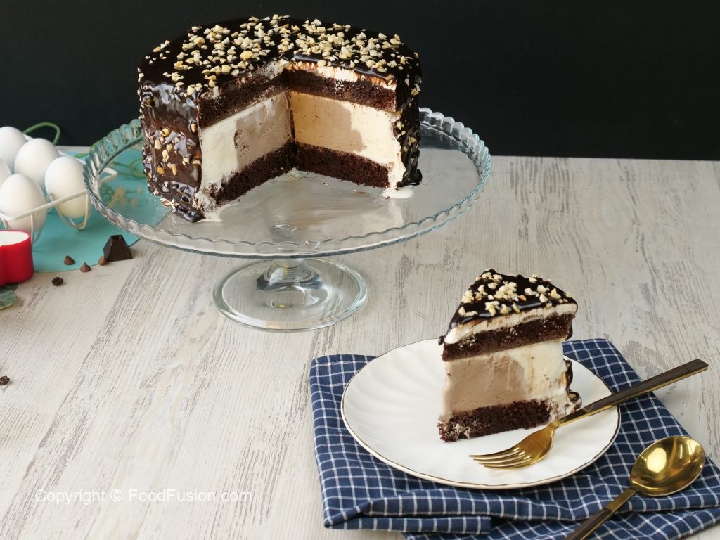 Ice cream layer sa cling film ko remove ker lein & cake layer ka upper rakh dein,chococlate ganache drizzle dal dein,ek aur cake ki layer rakh dein aur cling film sa cover ker ka 4-6 hours kliya freeze ker lein.