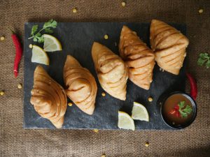 Fill the cone with prepared stuffing,apply water on the edges and bring the edges together and seal the edges properly.