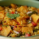 Serving dish mein radga chaat,pyaz,tamatar,hari mirch,spicy green chutney,tamarind sauce,sev nimco,papri,hara dhania aur chaat masala dal ker serve karein!