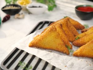-First, dip samosa in whisked eggs, then coat evenly in bread crumbs.