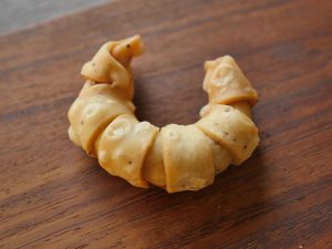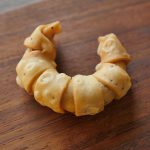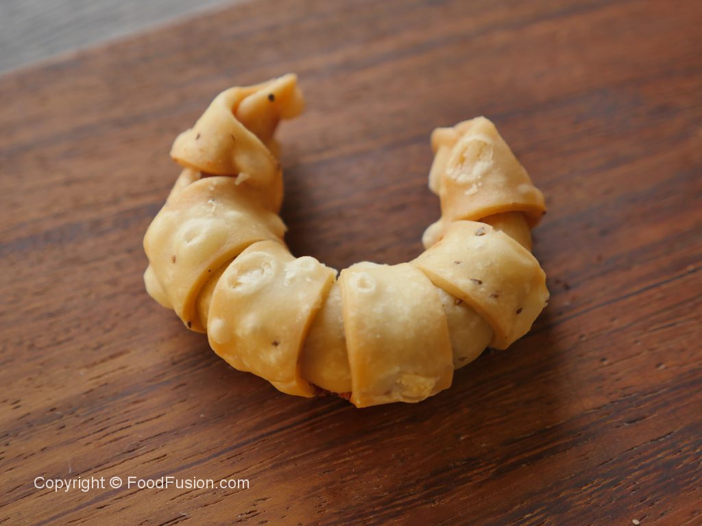 Cut the dough into four equal parts and stretch it,add filling and fold both edges and roll out completely to make a parcel shape.