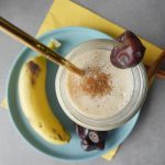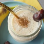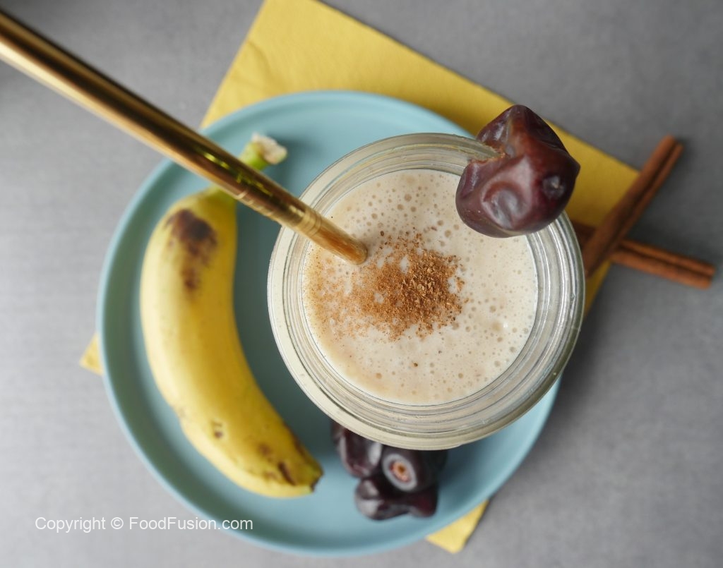 In blender jar,add dates (deseeded),banana,yogurt,milk,cinnamon powder,ice cubes and blend until well combined.