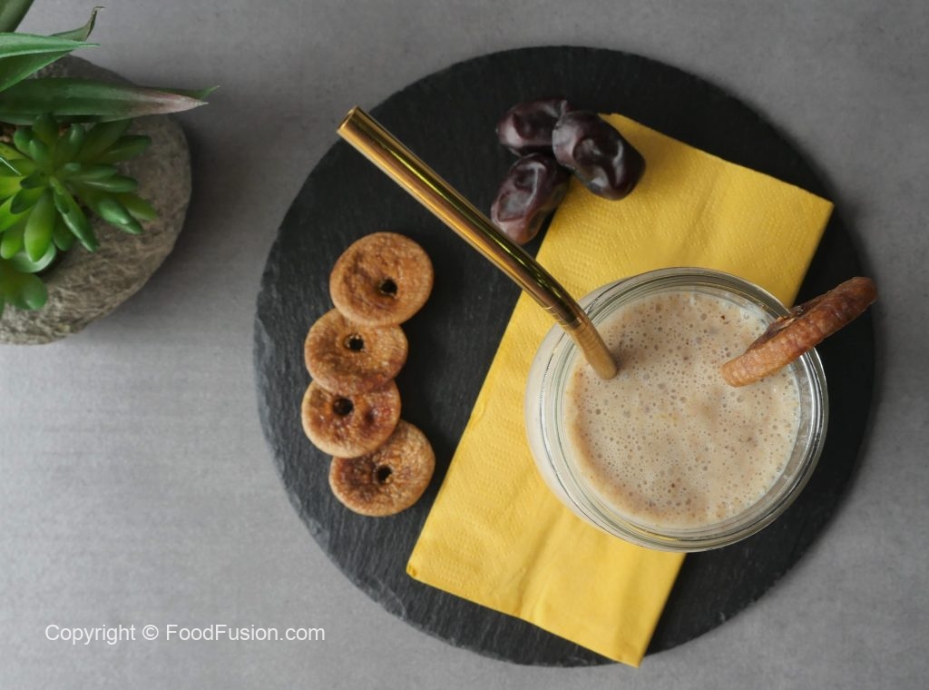 In blender,add soaked figs+dates+milk,ice cubes and blend until well combined.