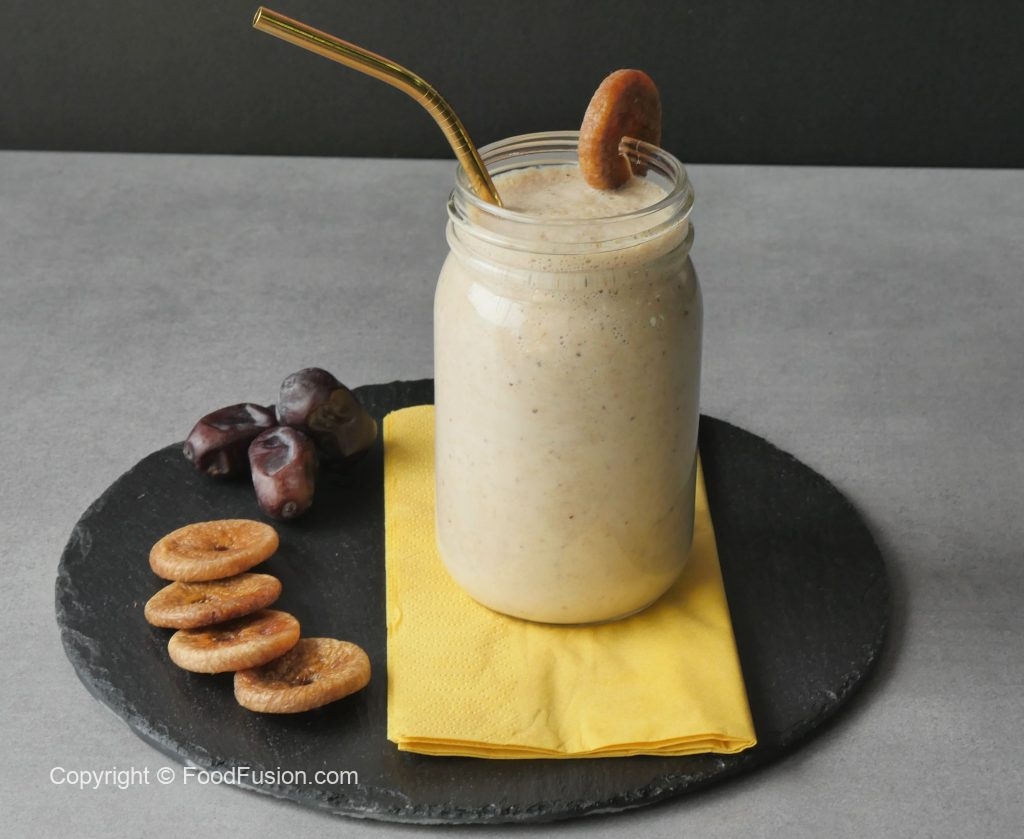 Blender mein soaked injeer+khajure+doodh aur ice cubes dal ker ache tarhan blend ker lein.