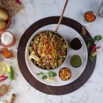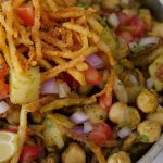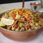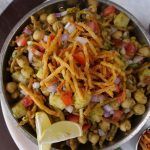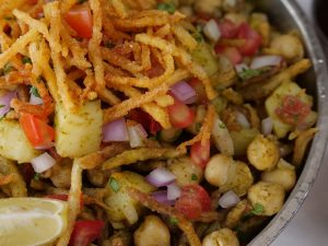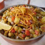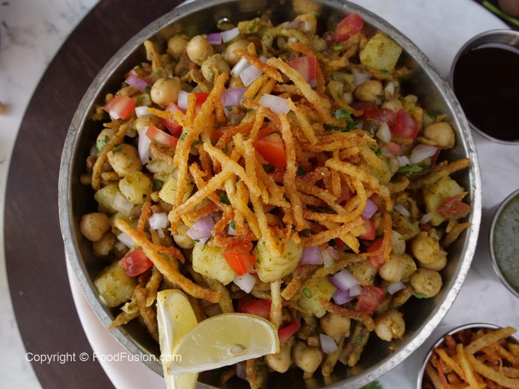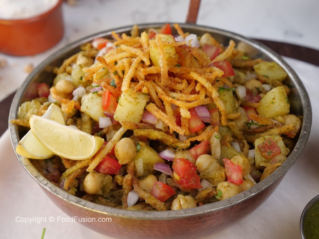 -In a bowl,add chickpeas,potatoes,tomato,onion,prepared chilli chips,spicy green chutney,sweet tamarind chutney,fresh coriander & lemon juice,mix well & serve!