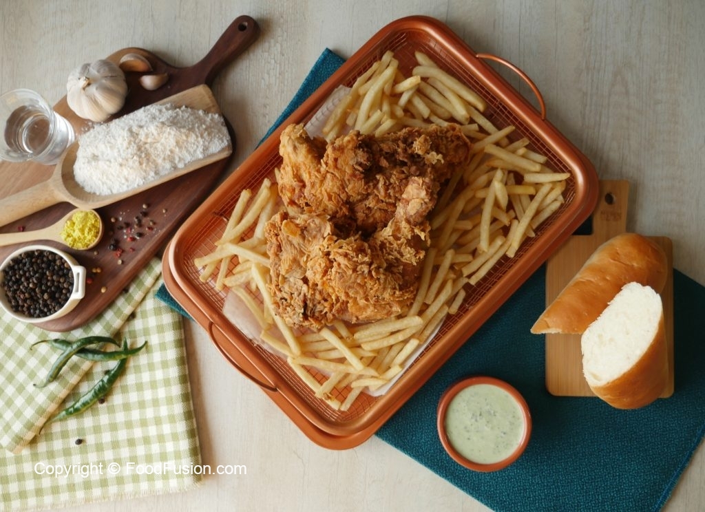 Karhai mein cooking oil (155 C) per garam karein aur chicken pieces ko halki ancch per golden & crispy hunay tak fry ker lein (10-12 minutes).