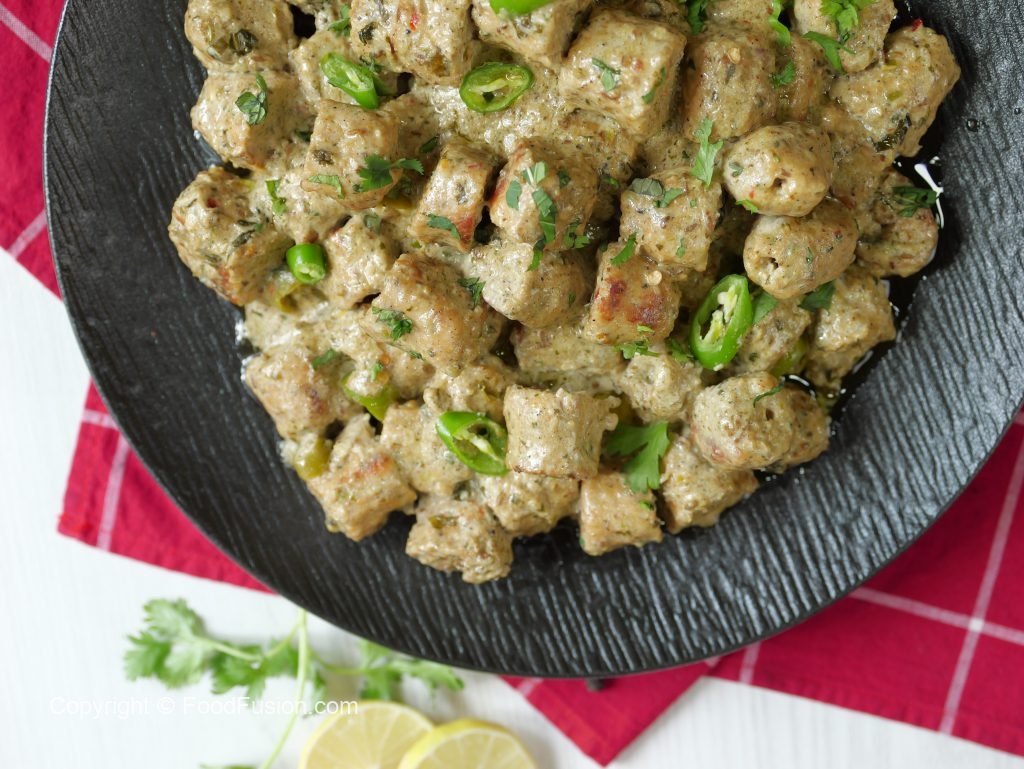 -In a large griddle,add cooking oil & fry steamed cooked kababs (10 kababs) on medium flame from all sides until golden than cut all the kababs in 1-inch pieces & cook for a minute.