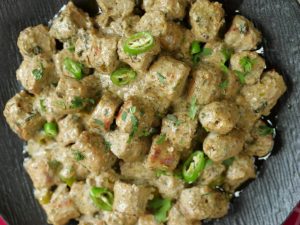 -Tayyar creamy sauce mixture ki half quantity,hara dhania aur hari mirch dal ker ache tarhan mix karein aur darmiyani ancch per 4-5 miutes kliya paka lein.
