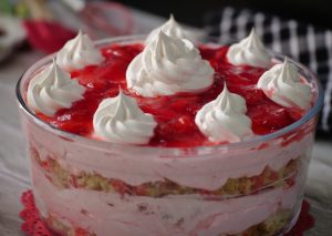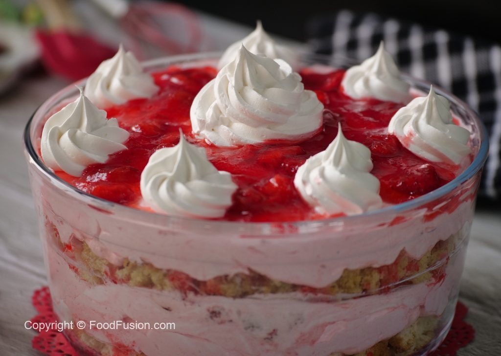 In a serving gar,add prepared strawberry jello,crumbled plain sponge cake,prepared strawberry cream, prepared strawberry jello,crumbled angel food cake or plain sponge cake,prepared strawberry cream & garnish with reserved whipped cream & strawberry jello.