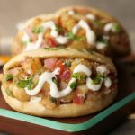 Add prepared stuffing, drizzle whisked yogurt, fresh coriander on top & serve!