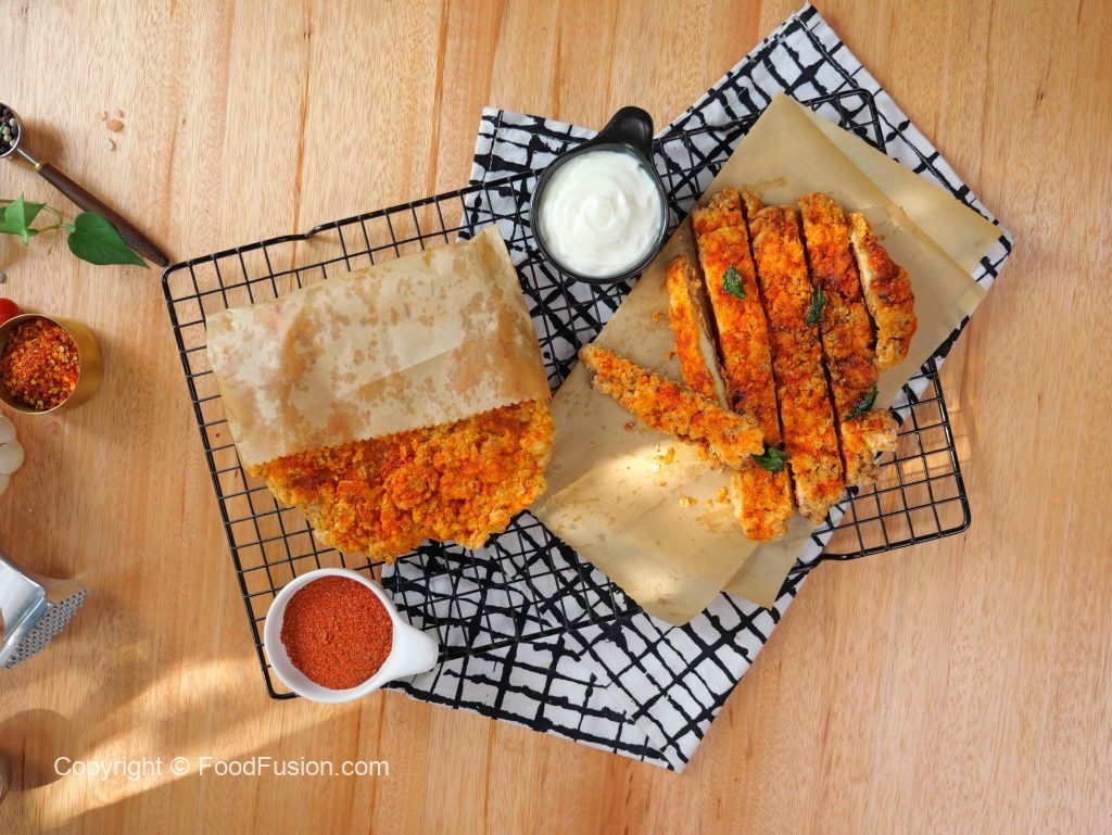 Chicken fillet ko cutting board par rakh kar side se cut karen, open karen aur butterfly shape bana kar flatten karlen.