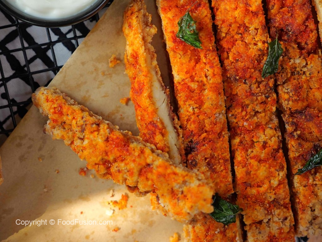 -In a wide base bowl, add potato starch & bread crumbs, mix well.