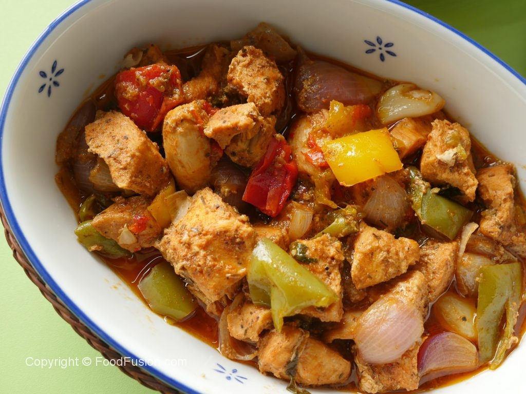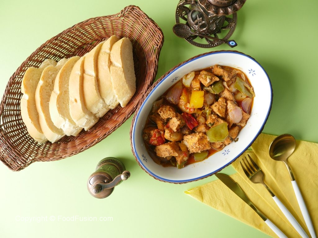 In bowl,add chicken boneless cubes,onion,colored bell pepper,garlic,green chilies,cumin seeds,paprika powder,dried thyme,black pepper crushed,salt,fresh basil leaves,tomato paste,sufi cooking oil and mix well.