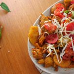 -In a serving platter, add fried pakoray, fried tomato & green chilli slices, pickle, garnish with cabbage & serve!