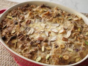 On baking dish,break puff pastry into pieces,sprinkle cinnamon powder,desiccated coconut,raisins, hazelnuts,walnuts,pistachios,prepared milk,topped with cream and sprinkle almonds.